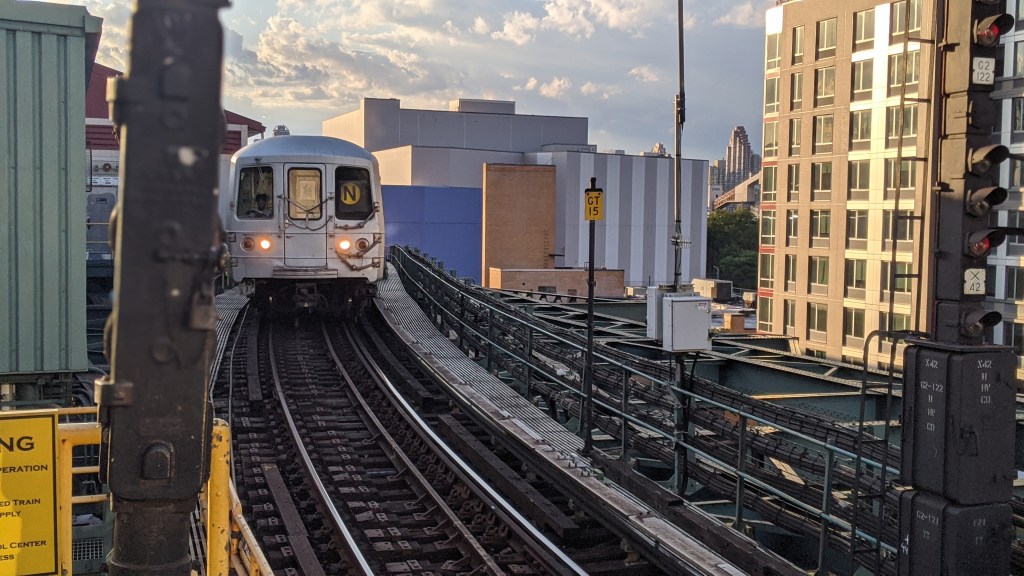 Looking west from the upper level of Queensboro Plaza as an Astoria-bound (N) train enters the station
