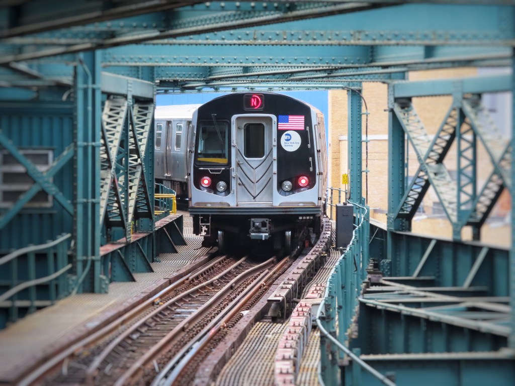 A Manhattan-bound (N) train crosses over the Queensboro Bridge pedestrian path. Note the unused trackway above the train, which once led to the BMT half of the station