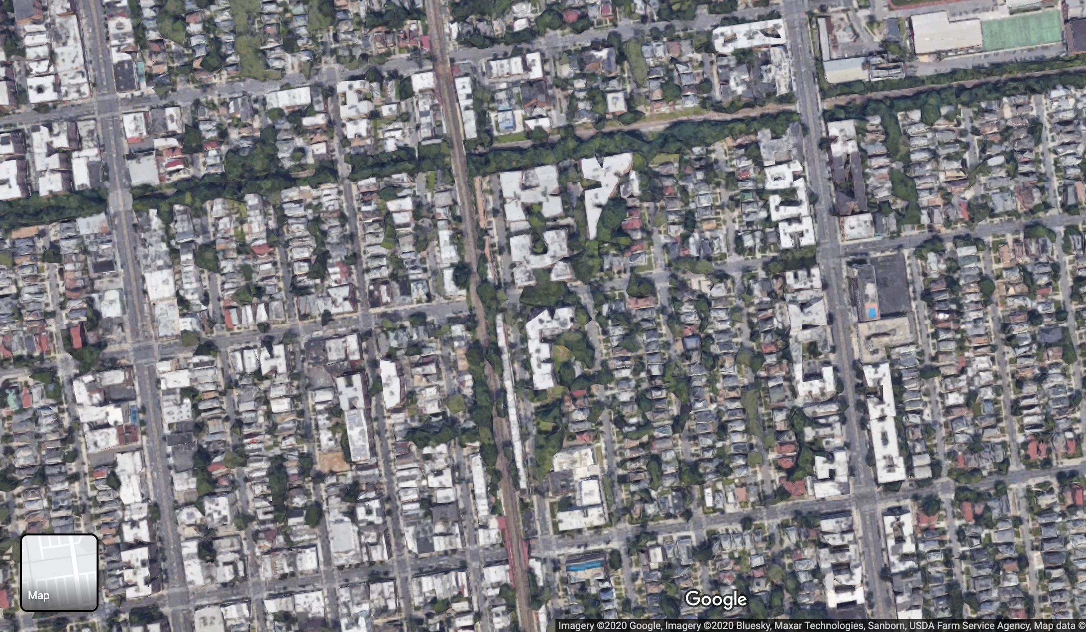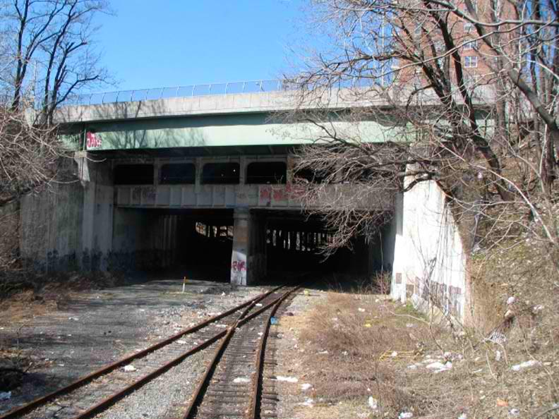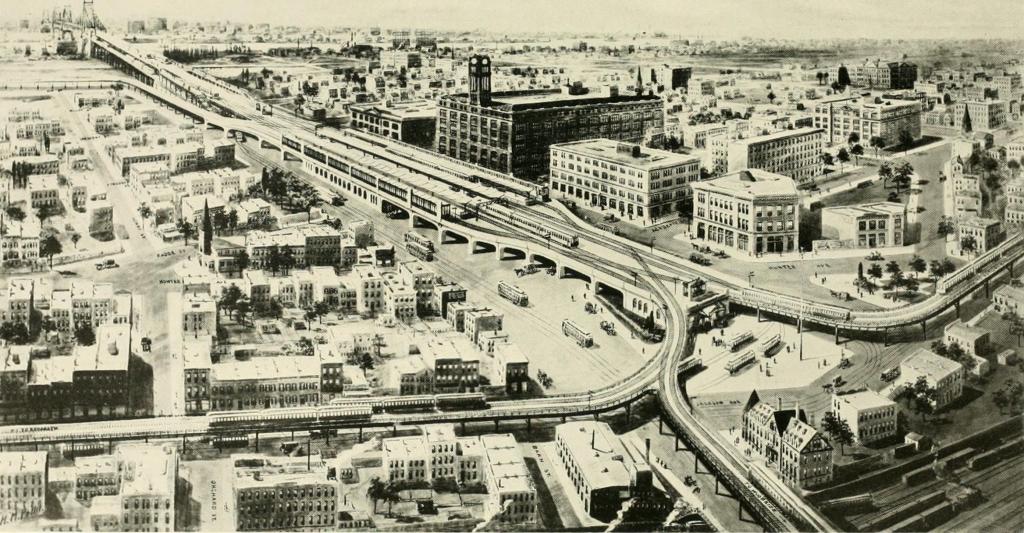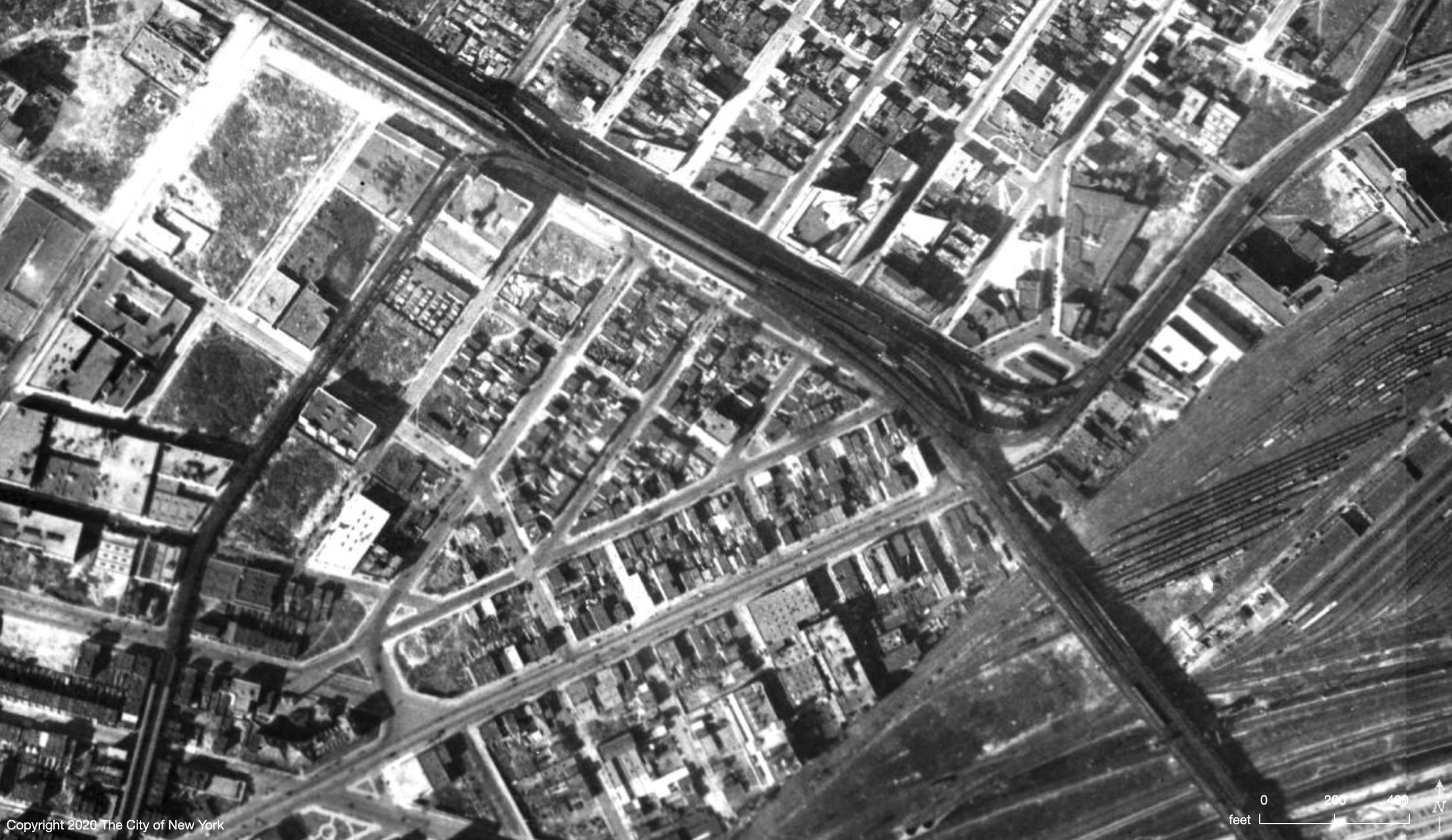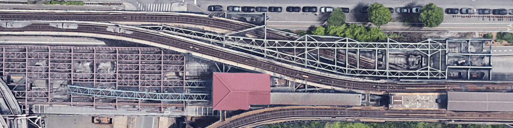 Note in the image above the extra set of tracks coming from the southeast (foreground). These might be the tracks of the proposed elevated crosstown line which was never built.