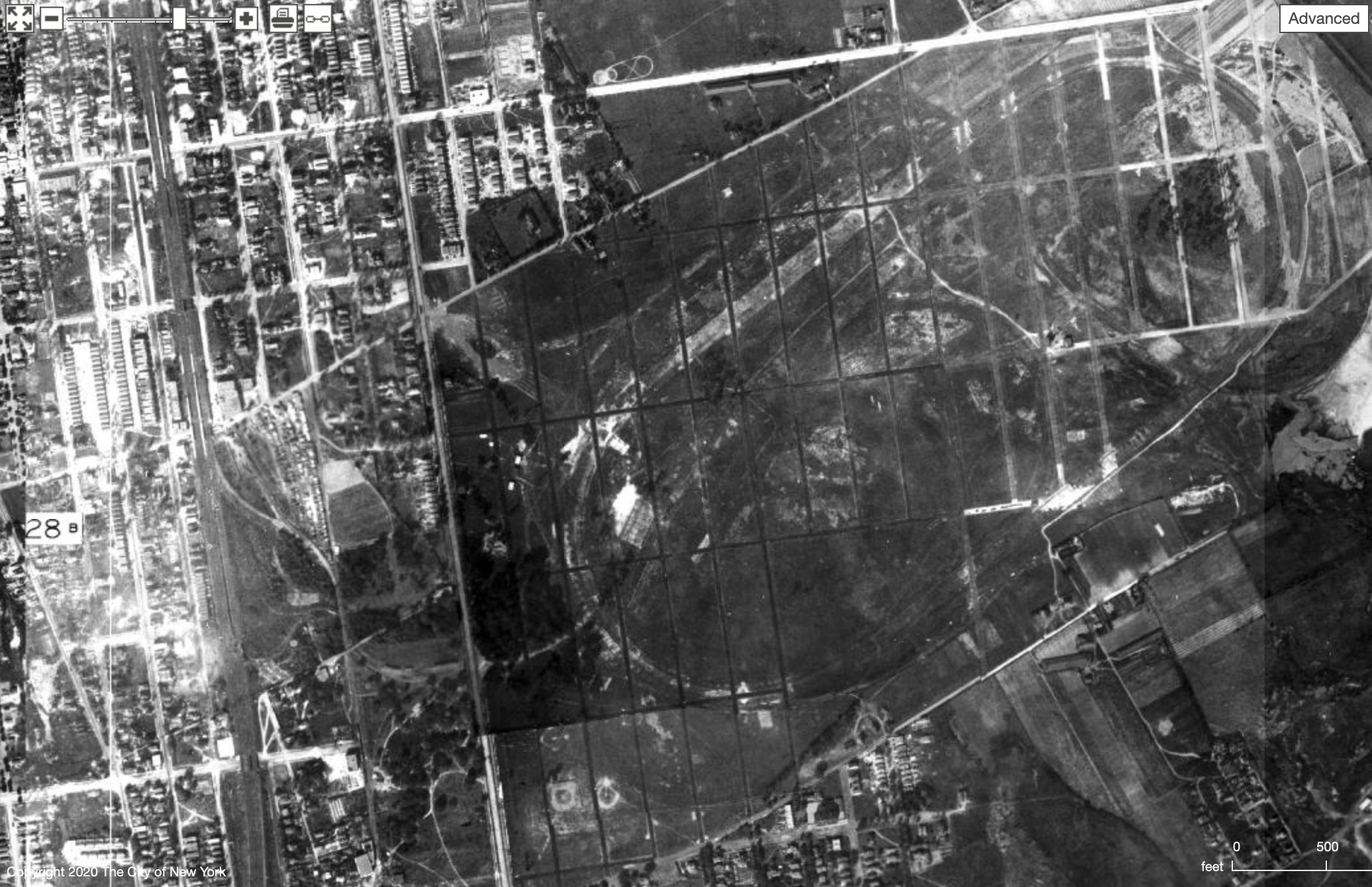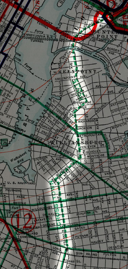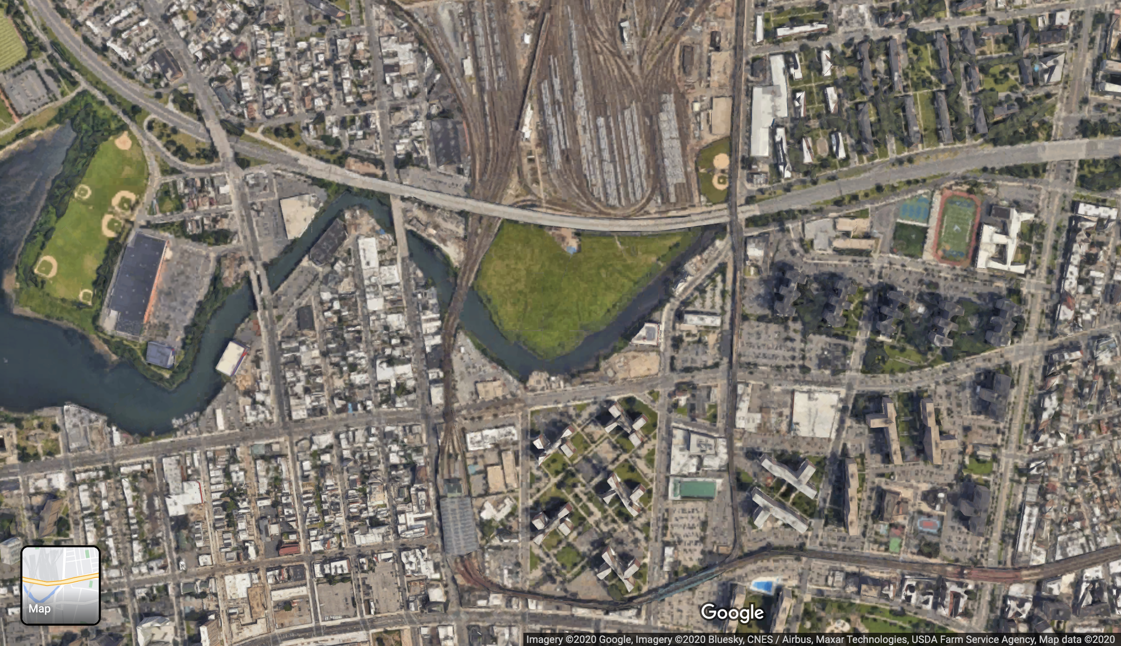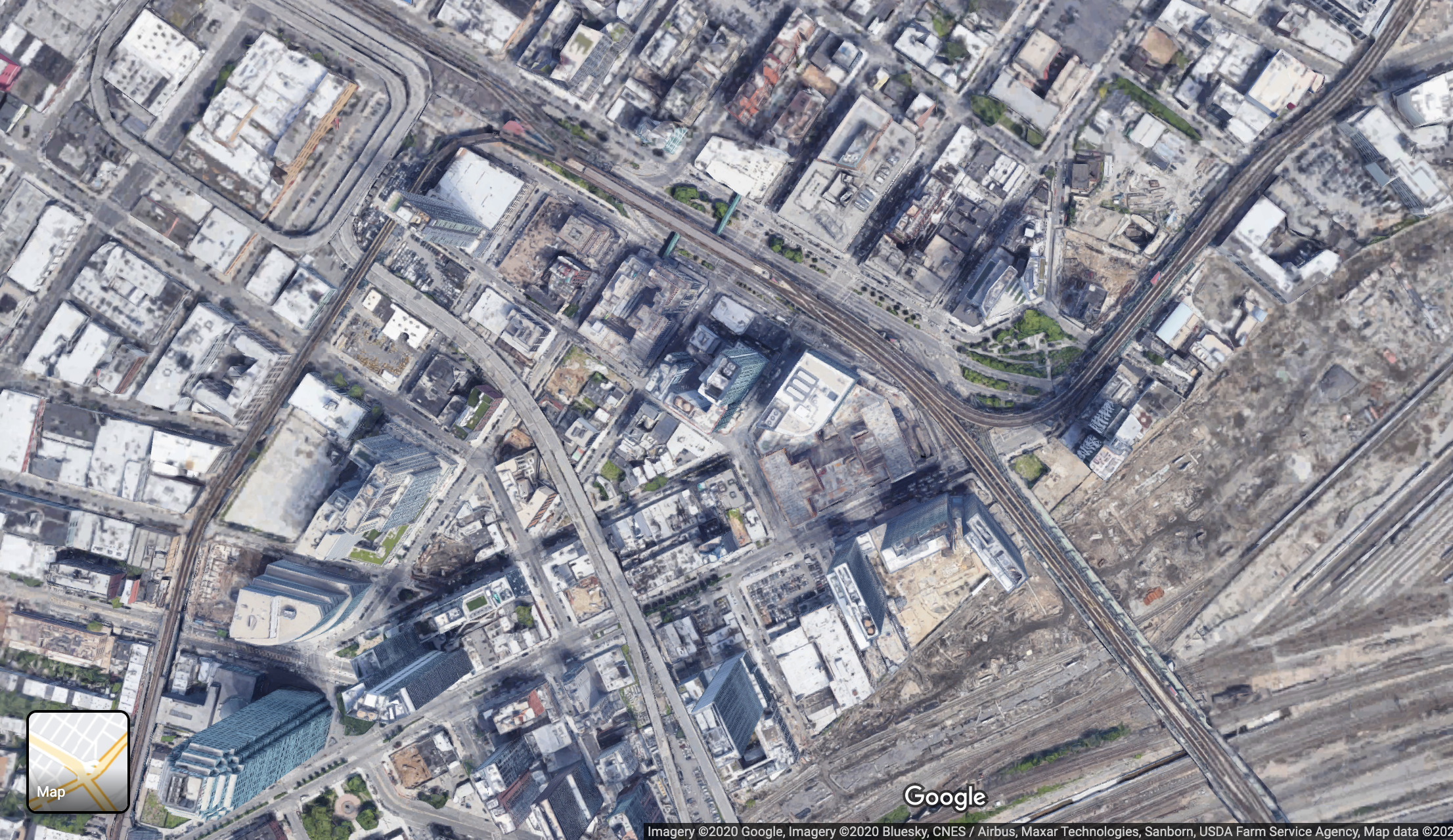Note in the image above the extra set of tracks coming from the southeast (foreground). These might be the tracks of the proposed elevated crosstown line which was never built.