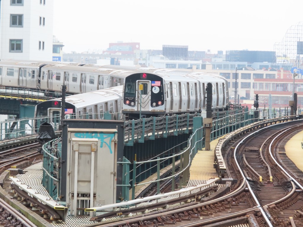 Two (N) trains pass each other east of the station. The one on the left is descending into the lower level