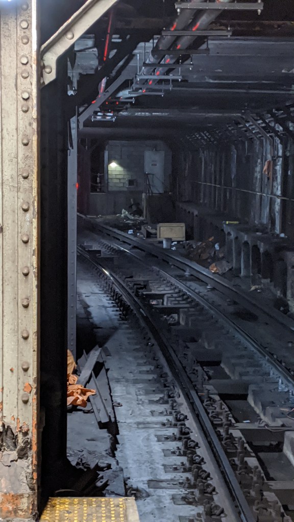 At the eastern end of the station, a number of trackways are still visible. To the top left of the photo are the tracks that carried BMT El trains from Flushing into and out of Queensboro Plaza. The bottom of the photo shows the track that connected to both the upper and lower levels of the BMT subway platforms. This track, at the bottom of the Flushing line to the right of the image was a single track. BMT subway trains would enter the Queensboro Plaza upper level from the 60th St tunnel, then continue past the station onto this single track, at which point the crew would move to the other end of the train and drive it into the lower level of Queensboro Plaza, then onward into Manhattan.