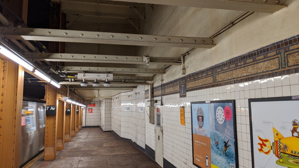 The 7th Ave station is a fascinating one, not because it is interesting in and of itself, but because of the Flatbush Tunnel of which it is a part. The Flatbush Tunnel contains six tracks, across both divisions of the subway. It was built as part of the Dual Contracts between the City and the IRT and BRT companies. Part of that construction was upgrading BRT lines in Brooklyn, and expanding the existing IRT lines further into Brooklyn. Both of these goals were achieved by constructing the Flatbush Tunnel, which brought the IRT subway from Atlantic Ave east along Flatbush Avenue to Eastern Parkway where it continued into Brooklyn. The tunnel also connected the BRT’s Brighton Line from Prospect Park to the DeKalb Ave station in Downtown Brooklyn. The tunnel was built all at once, with four of the tracks being used by the IRT and two being used by the BRT. Despite being built as one whole, there is no transfer between the two competing companies’ lines in the tunnel, only at the western end at Atlantic Ave.