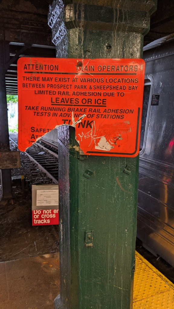 Due to the nature of the tracks, being outside and adjacent to residential neighborhoods, a common problem on the Brighton Line is leaves on the tracks. This is actually a serious issue for trains, and leaves, especially wet leaves, in between the trains wheels and the rails can cause wheel slip, and reduce the friction and therefore the grip that the train has on the tracks. Branches falling on the tracks is also not uncommon.