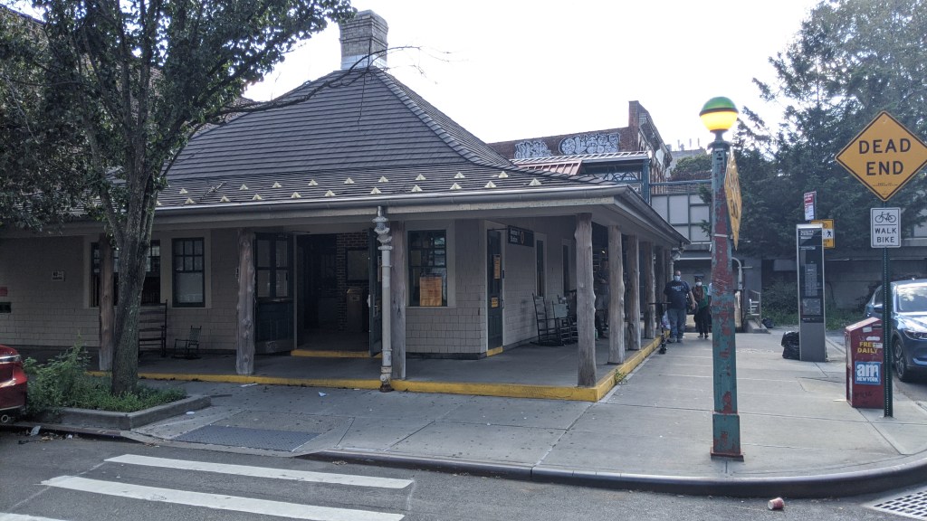 The northbound station house at Avenue H really goes all in on the “house” aspect. It looks like a regular suburban home, complete with a porch, a chimney, and wooden rocking chairs.
