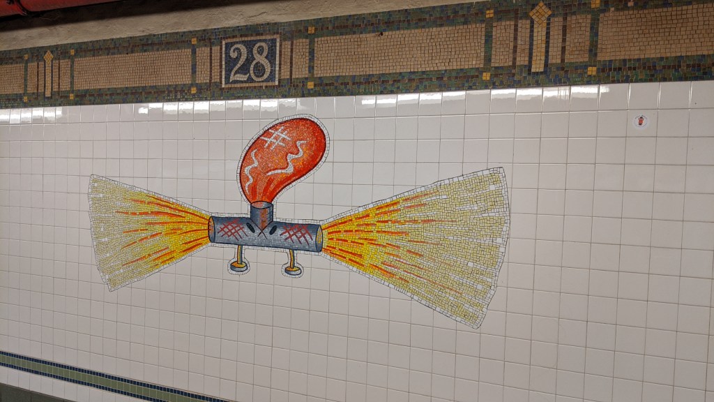 For some reason, one that I have never been able to find out, the southbound platform is slightly raised above the northbound one at the southern end of the station. 34th St-Herald Sq is an incredibly complex station, but the BMT platforms were one of the first to be built. There is an art installation on the platform, where you can make sounds by waving your hand in front of openings in a metal tube.