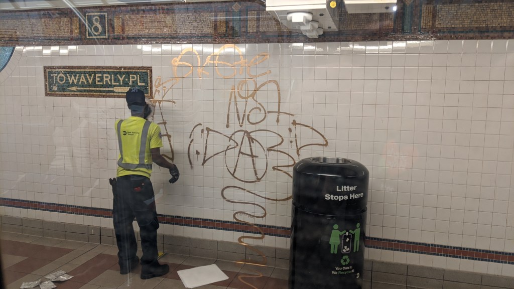 As trains leave DeKalb Ave towards Manhattan, they pass by the abandoned Myrtle Ave station. This was a local station with two side platforms, and offered a connection to the former BMT Myrtle Ave El. The station was demolished in 1956 when the interlocking (a series of switches) north of DeKalb Ave was rebuilt. The southbound platform was completely destroyed, but the northbound platform remained intact. In 1980, Bill Brand installed the Masstransiscope, a series of 228 hand painted panels along the northbound platform. A wall with slits was placed at the platform edge, so as trains move past it, the images appear to be moving. I lived in Shanghai, China, for a few years, and in the metro tunnels there, advertisements would be put along the tunnel wall in a similar fashion, with hundreds of static images that look like a short video as trains pass by.