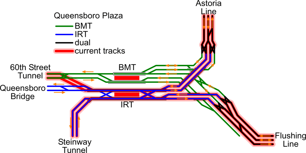 Queensboro Plaza is a shadow of its original self. It was double the size of the current station, and hosted both El and Subway service, as well as both BMT and IRT service, in one of the rare moments of cooperation between the two companies. The full station layout was basically a copy of what exists today to the north of the current station. It had eight tracks across two levels and a massive spaghetti junction to the east of the platforms. IRT trains used both sides of the current platform, and BMT trains used the north half of the station.