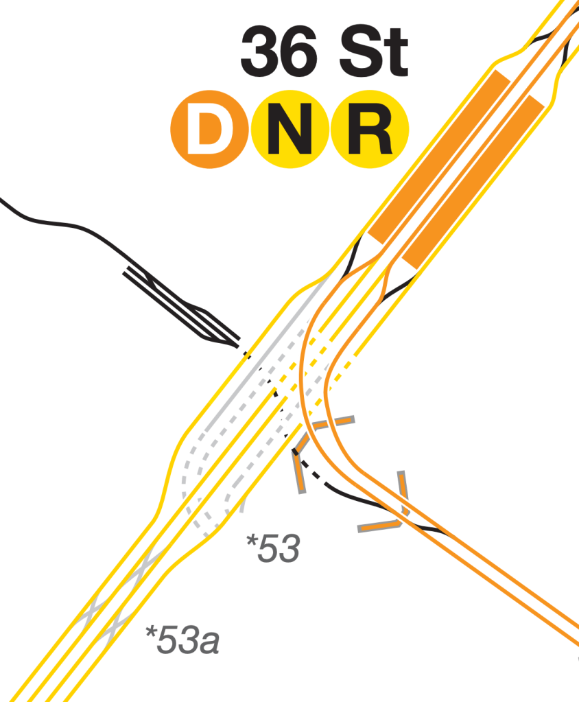 36th St is where the (D) train, from the West End Line, joins the 4th Ave Line. It has two tracks which come over the top of the 4th Ave subway tracks and descend in between the express and local tracks, before splitting, with West End trains able to join either the 4th Ave express or the 4th Ave local. Currently, (D) trains use the 4th Ave express, bu the before 2010, rush hour (M) trains (when the (M) was brown) would use the 4th Ave local tracks to reach the West End Line.