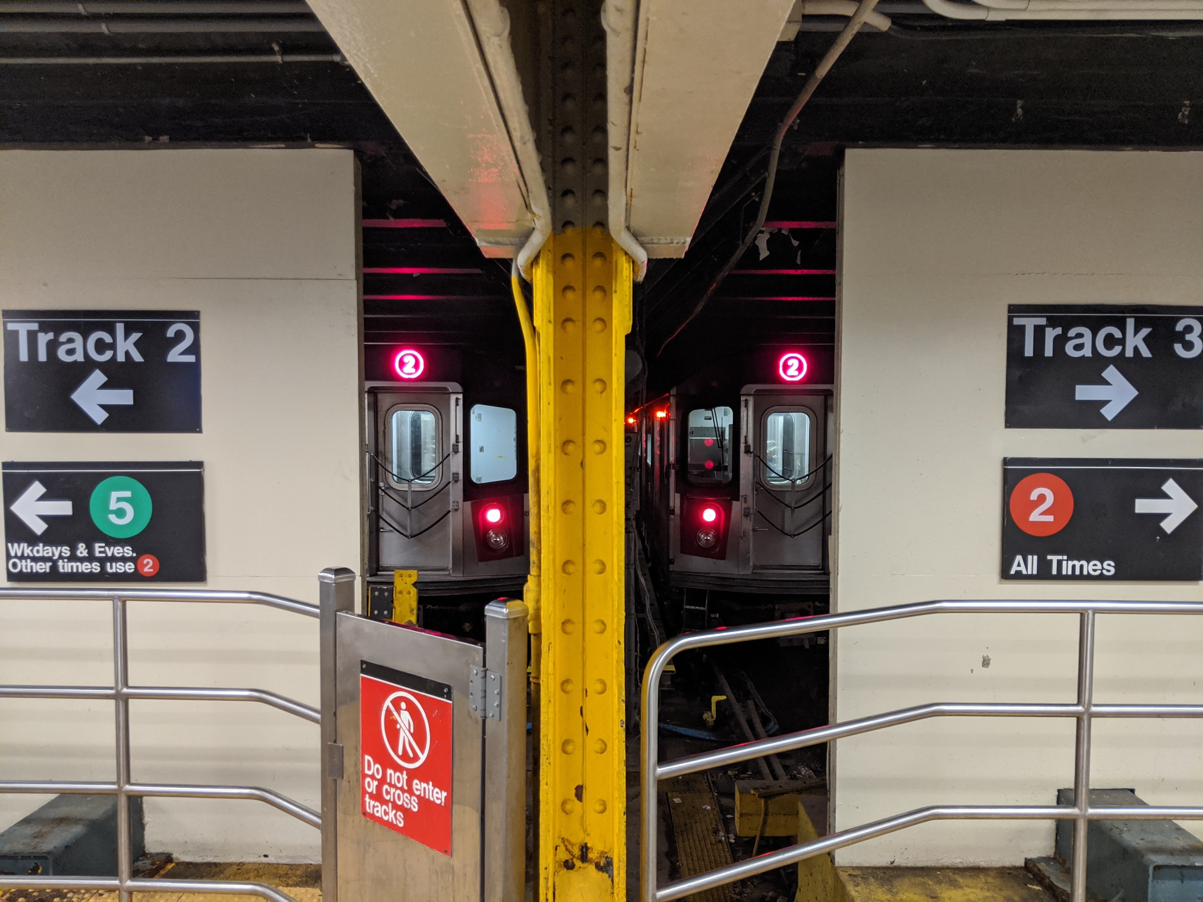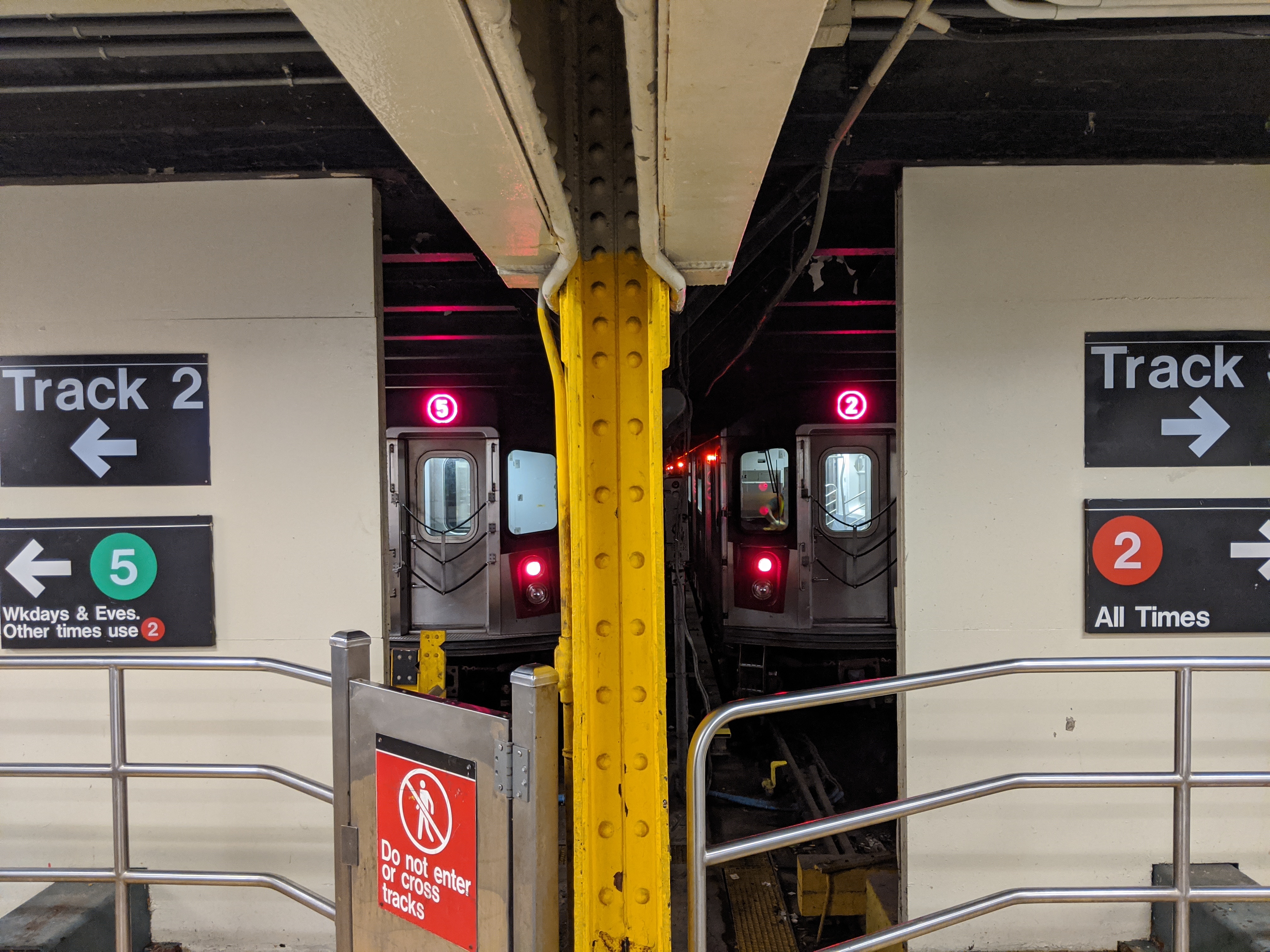 When the (5) serves this station, all (5) trains leave from Track 2 and all (2) trains leave from Track 3. Yes, despite only having two tracks, the tracks are labelled Track 2 and Track 3. The four-tracked IRT Eastern Pkwy Line, onto which the Nostrand Ave Line merges, is labelled Tracks 1-2-3-4 from left to right when looking north, with the middle express tracks being labelled Tracks 2 and 3. However, the Nostrand Ave Line tracks connect to the IRT Eastern Pkwy Line local tracks (Tracks 1 and 4), with another switch needed to reach the express tracks. I really don’t know why the IRT Nostrand Ave Line is labelled tracks 2 and 3 since the line is entirely local. The other solution might be to use Track 1 and Track 4 as those are the local track numbers.