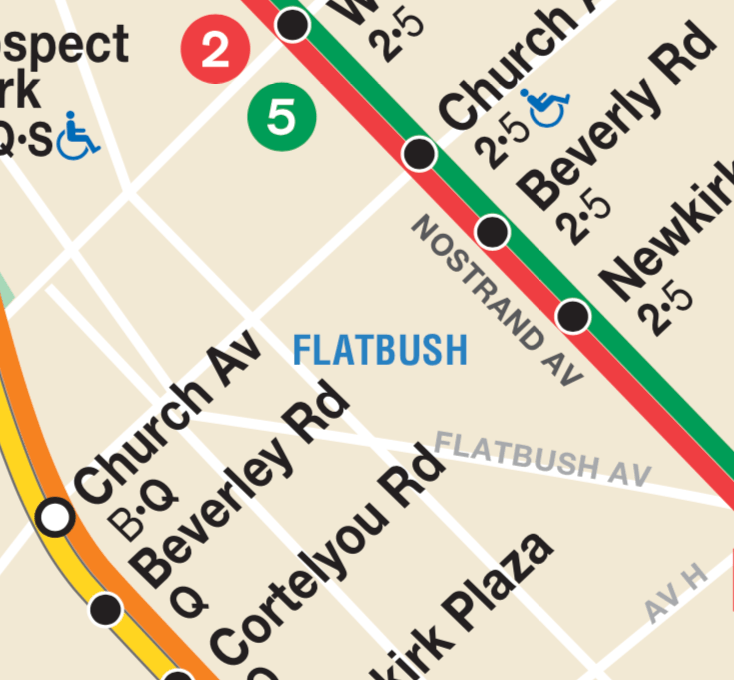 This station, like many on the IRT Nostrand Ave Line, shares a name with a station on the BMT Brighton Line. This station, however, is misspelled. The BMT Beverley Rd station is spelled with three “e”s, while the IRT Beverly Rd is spelled with only two. This is because Beverley Rd dog-legs at Flatbush Ave and is split in two between east of Flatbush Avenue and west. To the west the road was spelled Beverley and to the east it was spelled Beverly, although now both sides are spelled Beverley, making this IRT station the only station name that is misspelled.