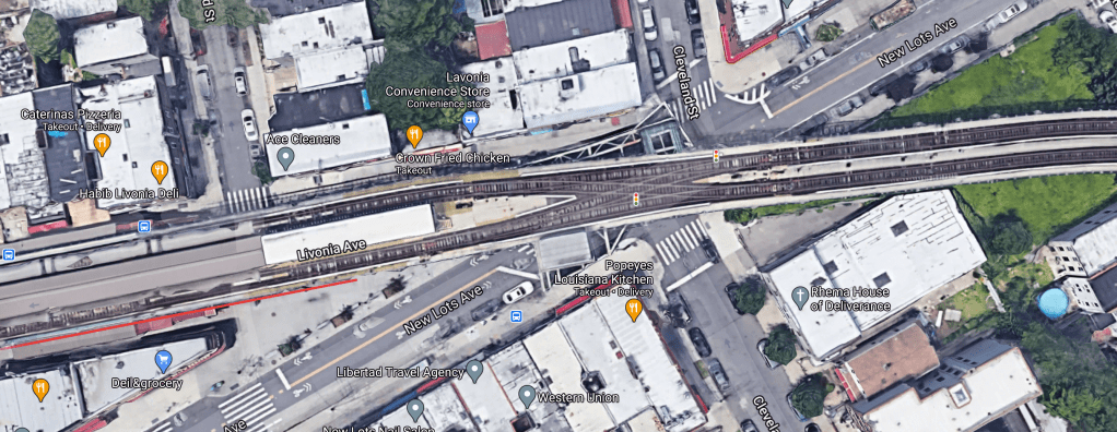 This is the highest station on the IRT New Lots Line, as it passes over the BMT Canarsie Line here. The Junius St (3) train station and the Livonia Ave (L) train station are very close to each other, but no in-system free transfer exists yet between the two, although one was planned as part of the 202-2024 budget. This is also the only station on the line in which the middle trackbed actually has a track in it. There is a lead to the Linden Shops, where switches and other track components are manufactured. This track is non-electrified and can therefore only be used by diesel equipment. This track merges with a track from the BMT Canarsie Line, making this one of four places where the A division (number lines) and B division (letter lines) have a connection. This is also one of two places where the subway has a connection to mainline railroads, as the Linden Shops are also connected to the LIRR Bay Ridge Branch.
