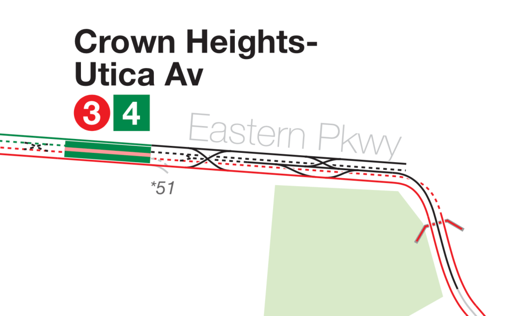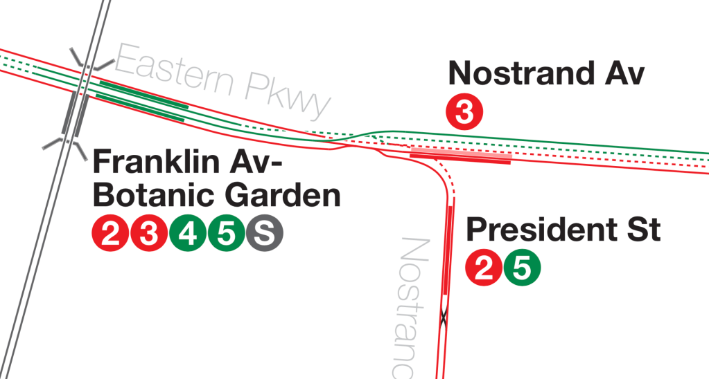 The MTA has considered rebuilding the junction into what is called a “flying junction” in which tracks pass over and under each other on different levels. The enormity of this project, which would include tearing up Eastern Parkway, and the more immediate needs of the rest of the system, have often prevented this fix from occurring. The other option is to simply add a switch east of the current junction on the Eastern Pkwy Line that allows express trains to access the local track after the Nostrand Ave Line has branched off. Under this fix, (4) and (5) trains would serve Eastern Pkwy, with one of the two becoming a local and continuing to the New Lots Line, and the (2) and (3) would serve Nostrand Ave and the Eastern Pkwy Local west of Franklin Ave.