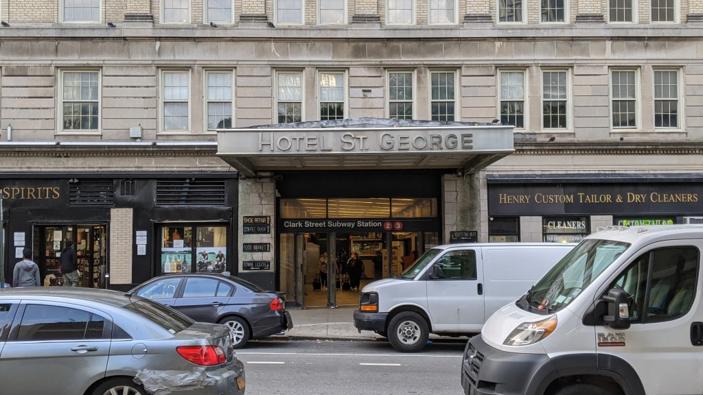 Clark St is quite a deep station, partially because it is the first station in Brooklyn past the East River, and partially because the Brooklyn Heights rise quite sharply out of the East River. The cross street of the station is Henry St rather than Clark St, and the subway runs along Clark St. This is one of three stations that are only accessible by elevators (incidentally the other two are also on the IRT Broadway-7th Ave Line, so we’ll get to them later). The station entrance is in the Hotel St. George, once the largest hotel in New York City.