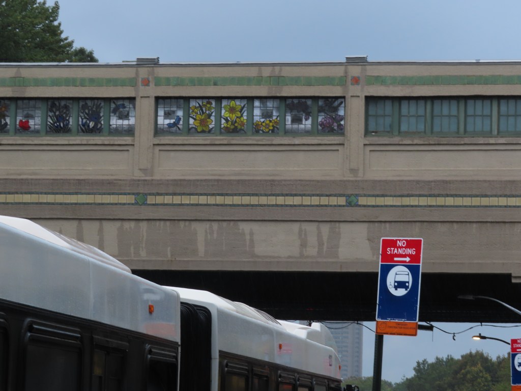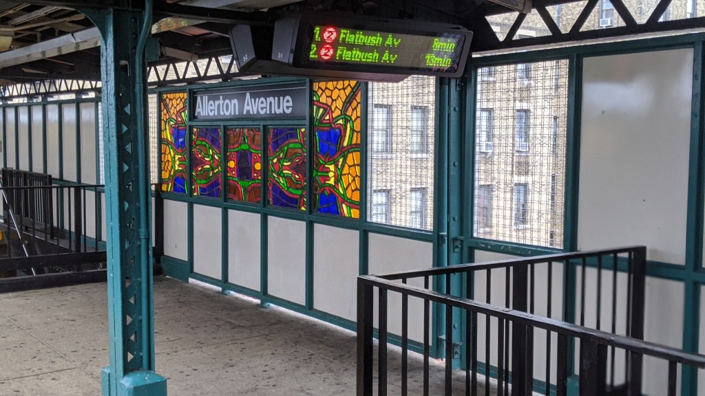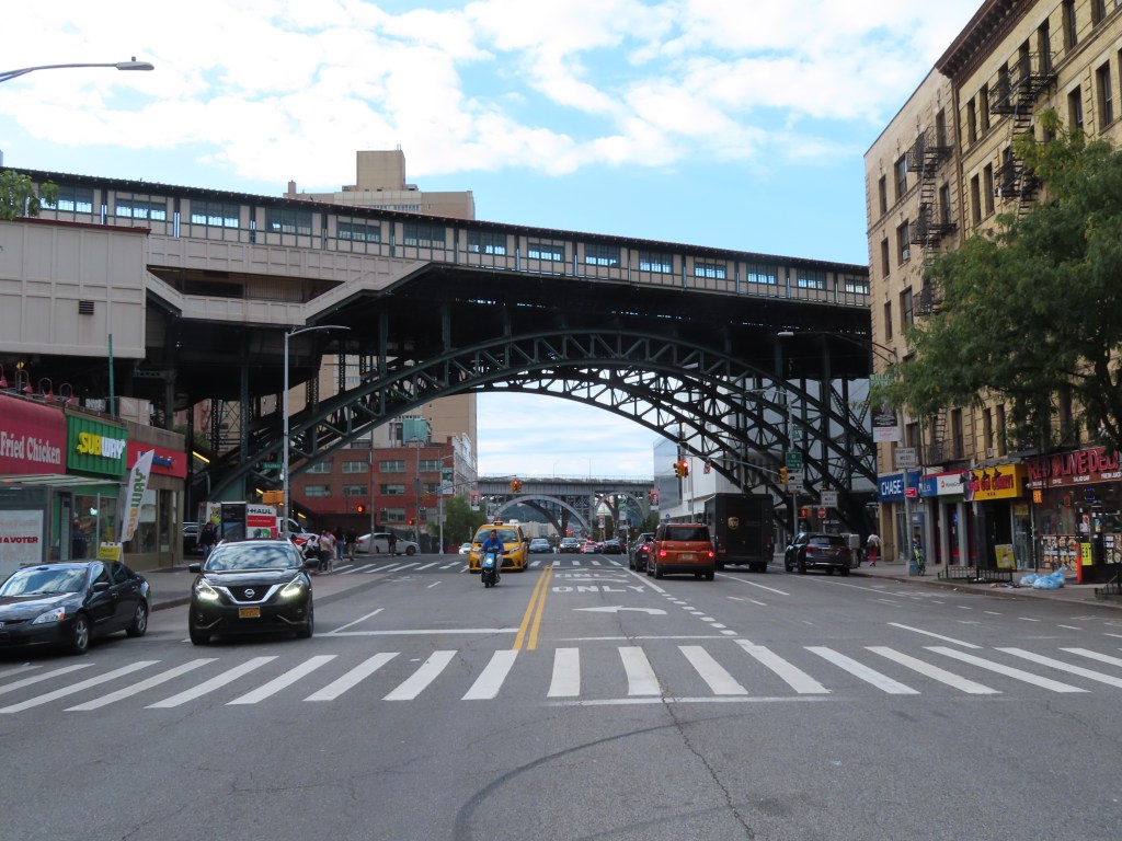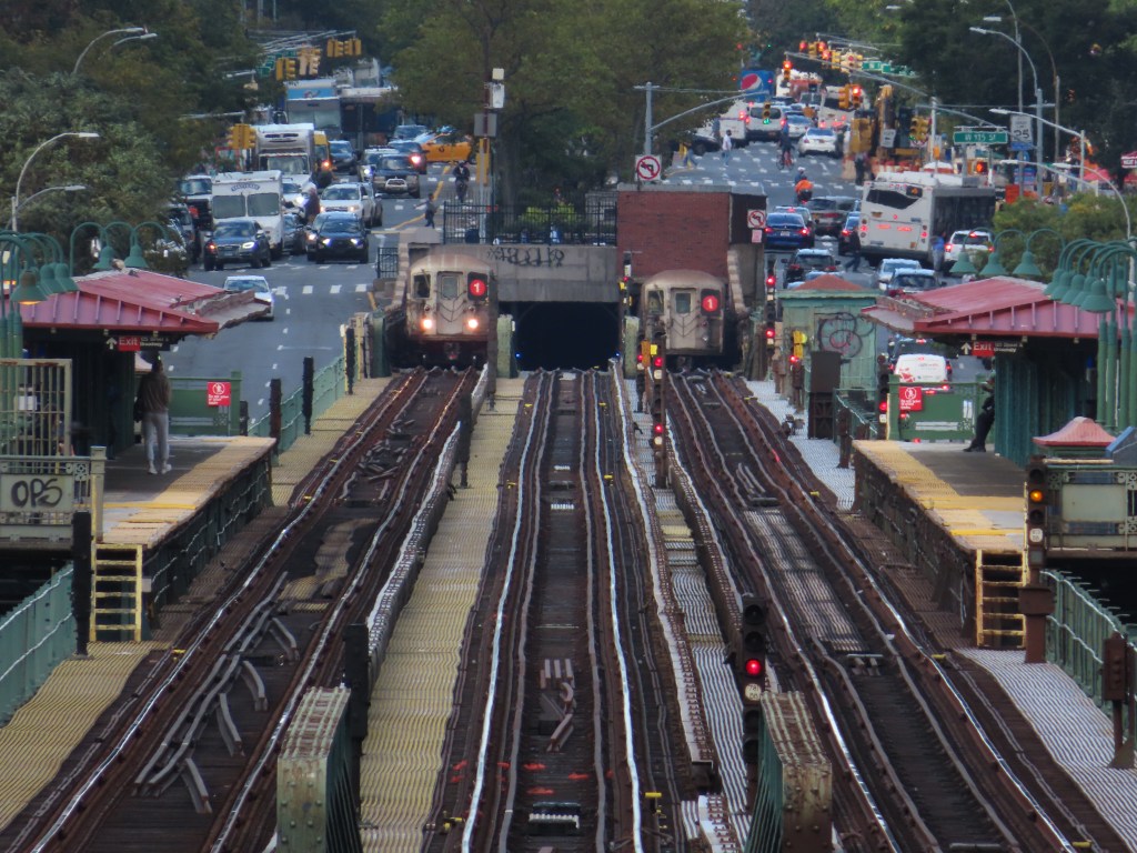 Because of the subway and former elevated and trolley lines here, this area is known as the Hub. The IRT 3rd Ave El opened in the area in 1887 and wasn’t demolished until 1973. The Bx55 bus replaced the 3rd Ave El, and a paper transfer was available at this station. Because of this existing transfer this station was one of the first to receive MetroCards in the early 1990s. Daylight can be seen at the eastern end of the platform as the tracks rise to an elevated structure almost immediately after leaving the station. An express tracks starts after this station and doesn’t have a stop until E 180th St, seven stations and 3.4 miles later, making it the second longest express run in the system.