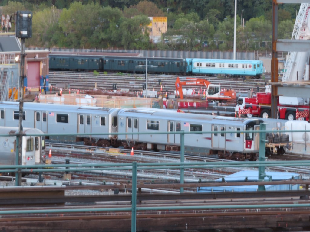 In the left foreground is a B division R46 train. In the middle ground is a train of A division R142A cars. In the background are two historical train sets. I believe the dark green one is a set of R9 cars, which were standard IND stock when that system opened. The blue and white train is the classic R33S, used on the IRT Flushing Line for the 1964 World’s Fair.
