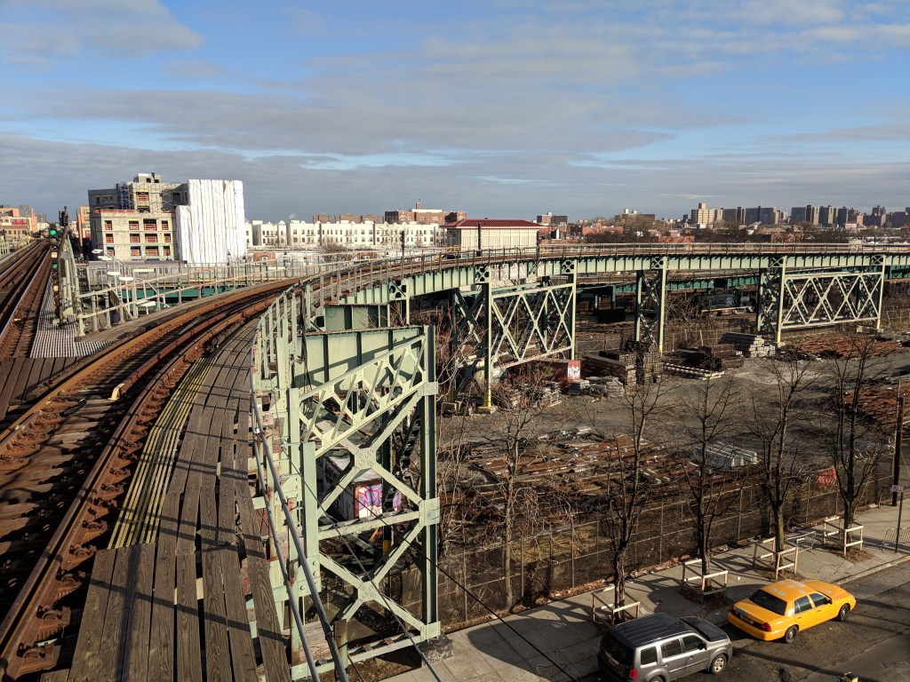 The two track connection to the 3rd Ave El rose above the two subway tracks in the middle of the subway tracks, on the green structure. The tracks are now gone. Image by Leo Shirky