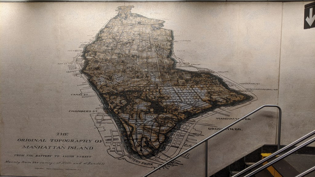 Once again, this station is unremarkable, except it sits underneath what is now called 7th Avenue South. The Commissioners’ Plan of 1811 laid out the system of avenues and streets that now exists north of Houston St, and in that plan, 7th Avenue was to end at Greenwich Ave and 11th St. The problem for the IRT was that they wanted to use 7th Avenue and Varick Street (under which Franklin, Canal, and Houston St stations are located) for their West Side Line, and these two streets didn’t connect. 7th Ave South was constructed in 1914, bulldozing through the historic West Village and wreaking havoc on the grid of streets that had already existed. The famously wonky intersections of the area is at least partially due to the subway.