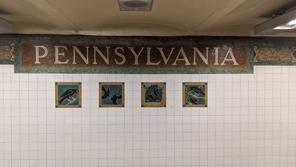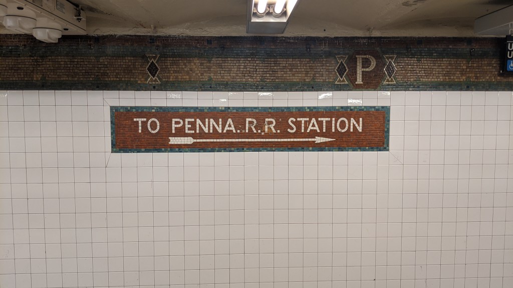 I always found it weird that a train station in New York was named for Pennsylvania, but this is of course named after the Pennsylvania Railroad, which built Penn Station. This explains the mosaics on the wall that say “PENNSYLVANIA”.