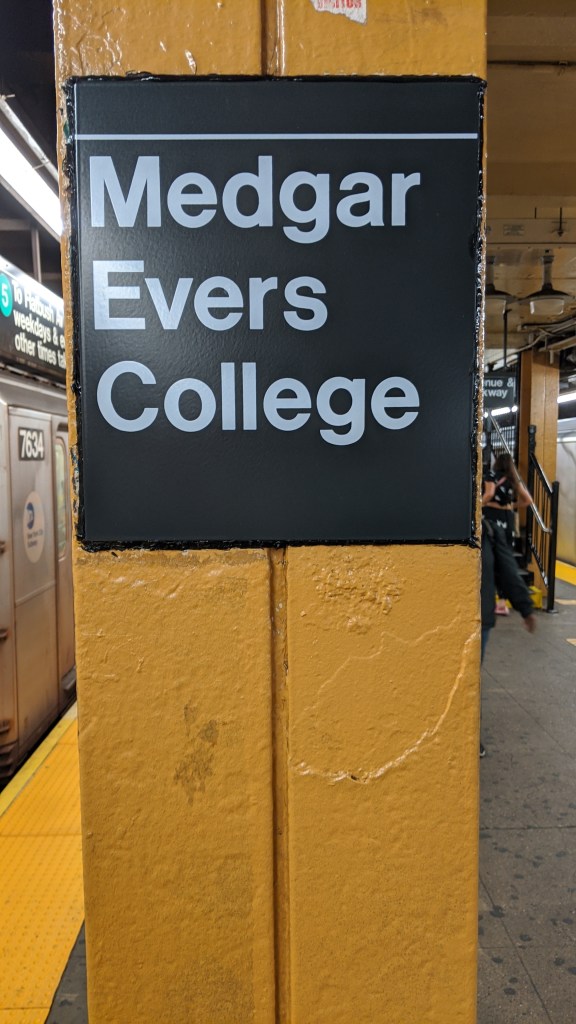 A new Medgar Evers College sign at Franklin Ave-Medgar Evers College station. Image by Leo Shirky