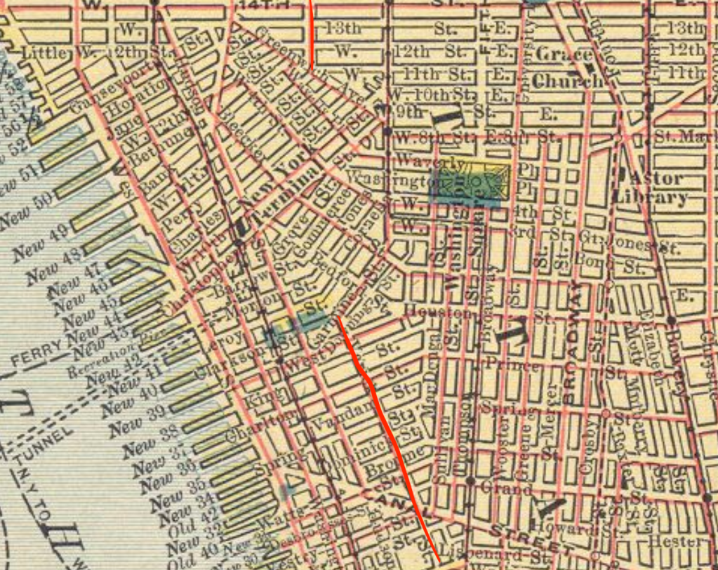 Snippet of a 1910 map of Manhattan. Varick St and 7th Ave are highlighted in red. 7th Ave South was built in a straight line between the two.