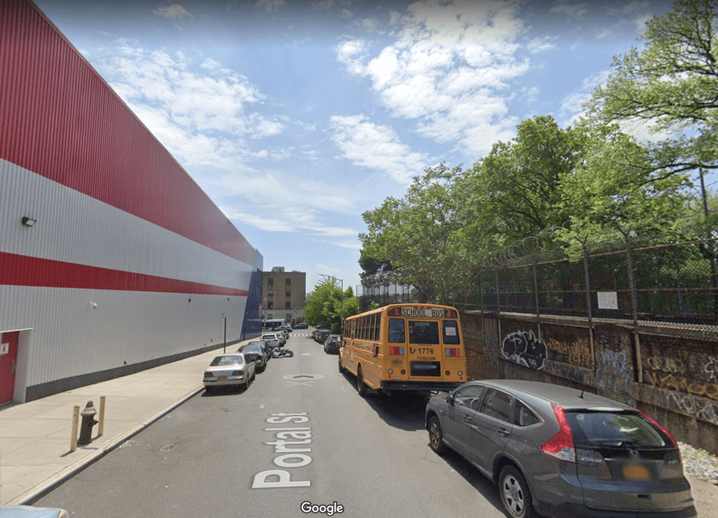 Looking southeast along Portal Street. Note the downward slope of the street. Behind the fencing to the right is the IRT New Lots Line. Image via Google Maps